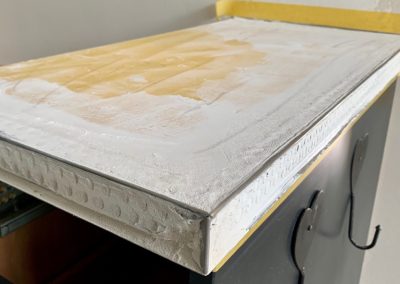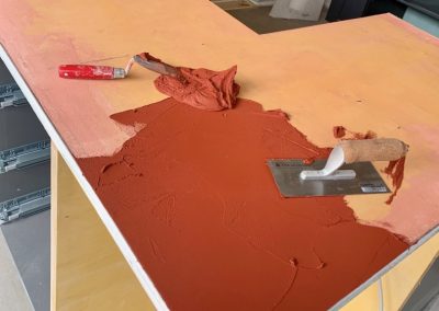 Und dann sind da noch die Arbeitsplatten. Der Küchenbauer hat sie in Multiplex Platten erstellt, die wir (eher ich, die die Mitarbeiter alle bei den Kunden unentbehrlich waren) mit Edelstahlkanten versehen und in vielen Arbeitsgängen in Beton Ciré gespachtelt, geschliffen und mehrfach versiegelt haben. Farbton? Eine Weile überlegt und habe mich dann für ein dunkles Backstein-Rot für die Kücheninsel (weil hier die Hitze ihr Zentrum hat) und ein warmes Grau/Beige (Dämmerung) für die umliegenden Bereiche entschieden.