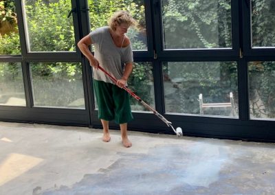 Dann ging es an den Boden: bei näherem Abklopfen stand fest: da gibt es nix zu überspachteln, die Fliesen kleben nicht gut und müssen alle raus. Hmm, okay, dann machen wir das so. Das Ergebnis: der Unterboden ist nicht wirklich tragfähig, das muss ebenfalls alles raus! Schutt- und Staubberge anstelle einer schnellen Spachtelung. Wir wühlen uns durch, erstellen einen neuen Boden aus OSB-Platten und spachteln diesen dann mit einer faserverstärkten Spachtelmasse. Ganz langsam sieht es einigermaßem ordentlich aus. Durch die verschiedenen Anbauten haben wir Dehnungsfugen im Boden. Eigentlich kommt in dem Fall eine Fuge mit zwei Edelstahlschienen hin. Das wollte ich aber nicht. Passt nicht zum Stil. Daher habe ich entschieden, an den beiden Stellen eine Holzschwelle einzulassen und dunkel zu lasieren. (Meine Mitarbeiter sind nicht immer begeistert über meine ständigen neuen Ideen, aber sie kriegen es immer hin. Super!) Genauso erging es den alten Treppenstufen ins OG, die in dem abgelaschten Buchenholz auch nicht mehr wirklich cool waren und jetzt, geschliffen und dunkel lasiert, viel, viel besser aussehen.